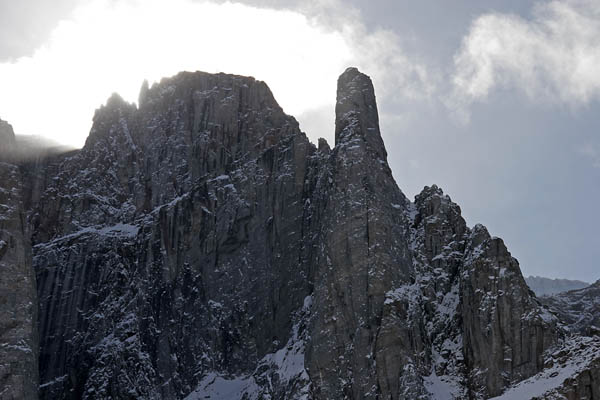 We skied into Walker Arm, past Polar Sun Spire and the Walker Citadel, and on into the Stewart Valley. Here one finds the Sail Peaks, which featured prominently in National Geographic Magazine in January 1999. Across the lake from the Sail Peaks there is a row of more south-facing and shorter walls, one of which had a team of climbers from the Netherlands on it when we were passing by that way. (We had chatted with them in Clyde airport upon arrival.) (The following picture shows Polar Sun Spire (L) and Kigut Pk. (R))