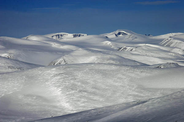 After a camp at an unprepossessing glacier snout west of Cape Jameson we spent a rest day at a fine site west of Nova Zembla Island and hiked up the nearby hill for views over sea-ice dappled by cloud shadows. While returning to camp we happened on a pair of brave ptarmigan who posed for numerous photos. (The following picture shows Qiajivik Mountain, highest mountain in north Baffin, as a large snow dome right of centre and over 30 km distant.)