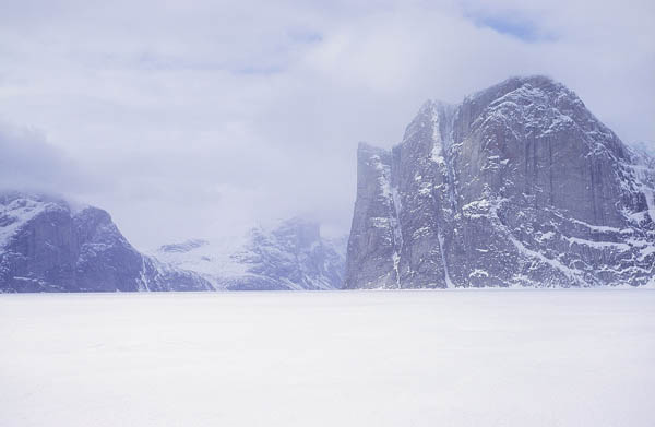 In 1994 John Dunn and I and three friends skied from Pond Inlet to Clyde River in north-eastern Baffin Island as part of John's ‘Baffin Traverse’ expedition. Having found the fiord country awe-inspiring and photographically rewarding, we decided to revisit the area this year (2007), this time with another friend, Paul vanPeenen. While our route was planned to be substantially similar, we would this time travel in the opposite direction, namely south-to-north. A main reason, apart from variety, for this change was that some land that was inaccessible to us on the Clyde River end in 1994 because of lack of snow would, presumably, still be easily skiable if we started there this time. This comment applies particularly to Revoir Pass, which connects Eglinton Fiord and Sam Ford Fiord, and which we could not ski across in 1994. (The following picture shows Eglinton Tower from Revoir Pass.)